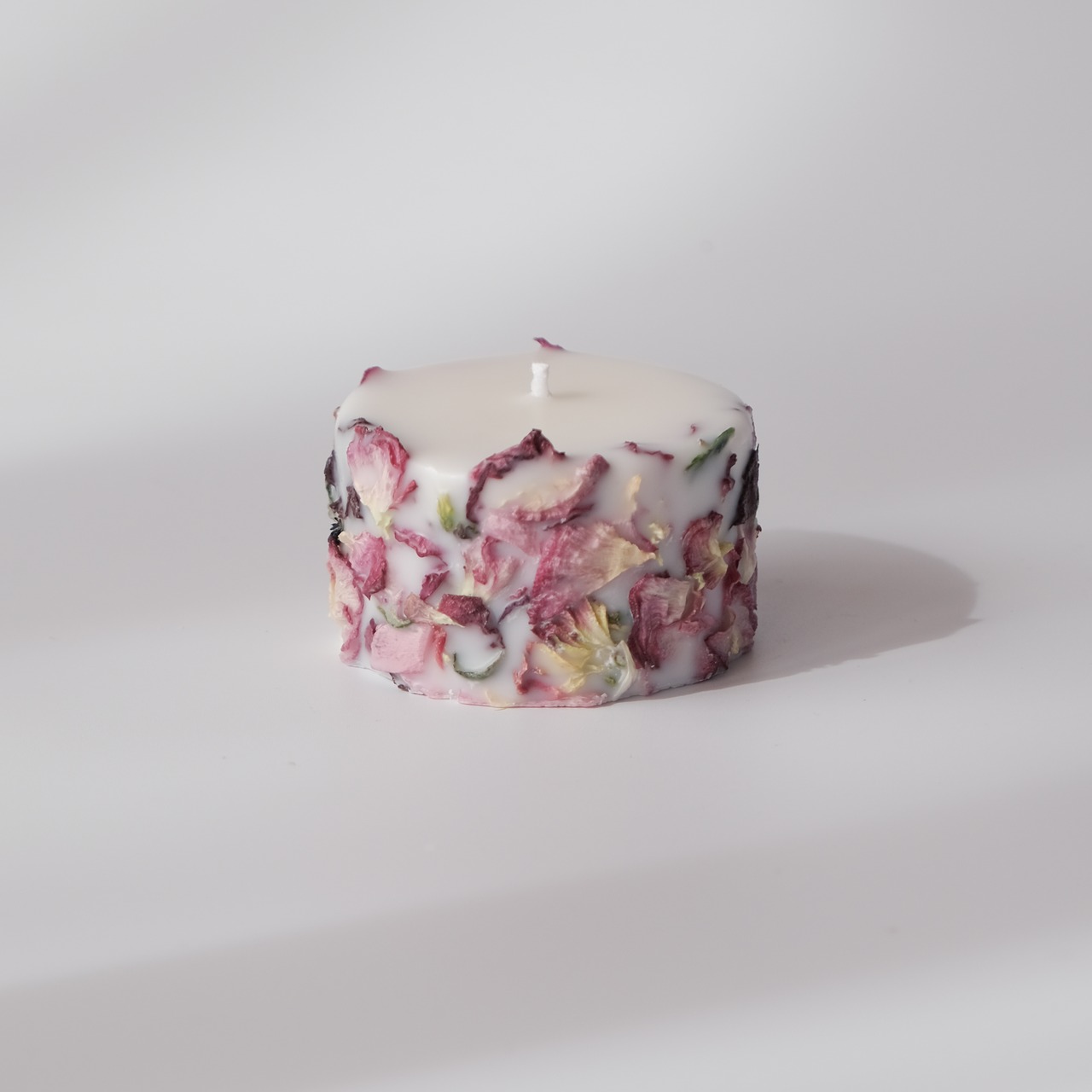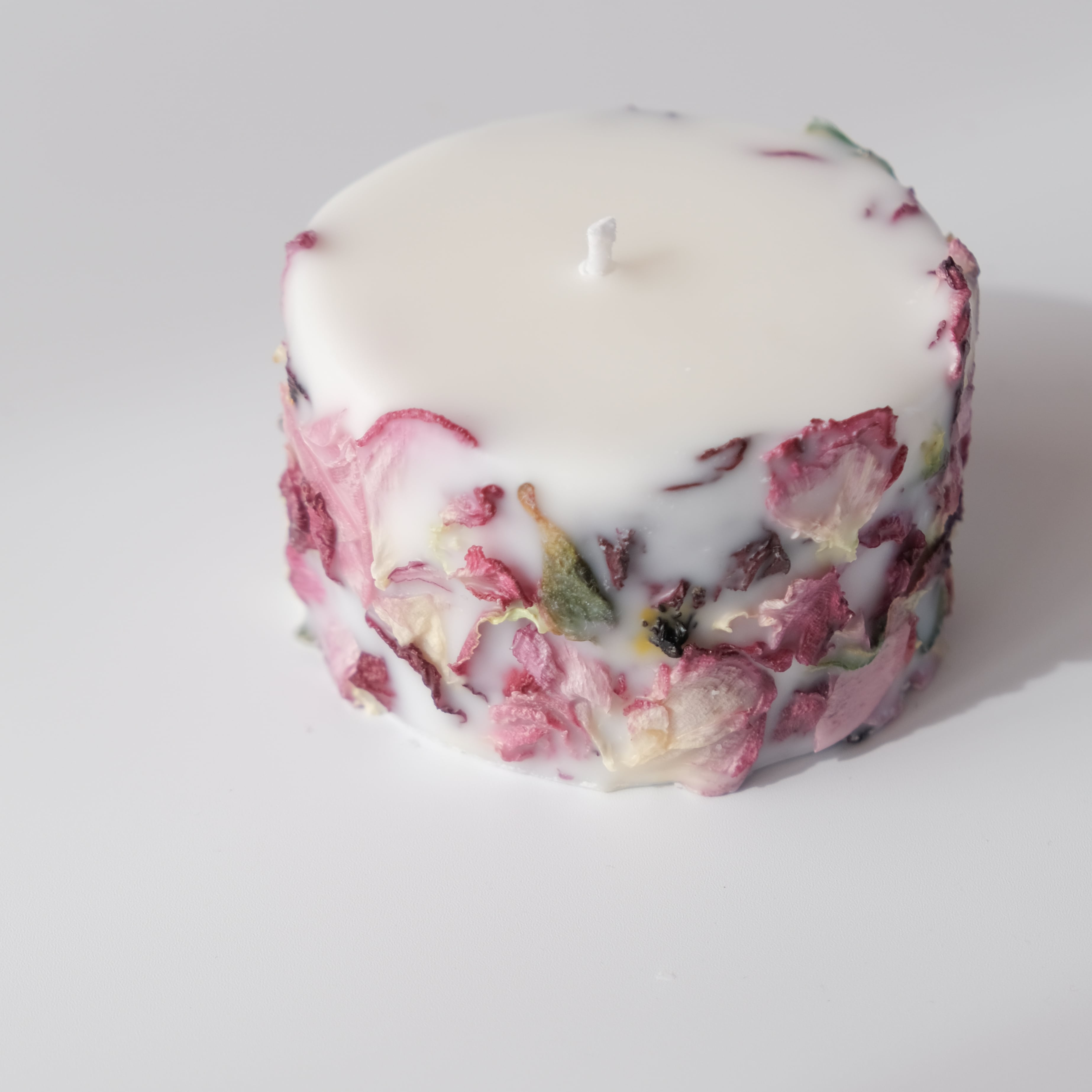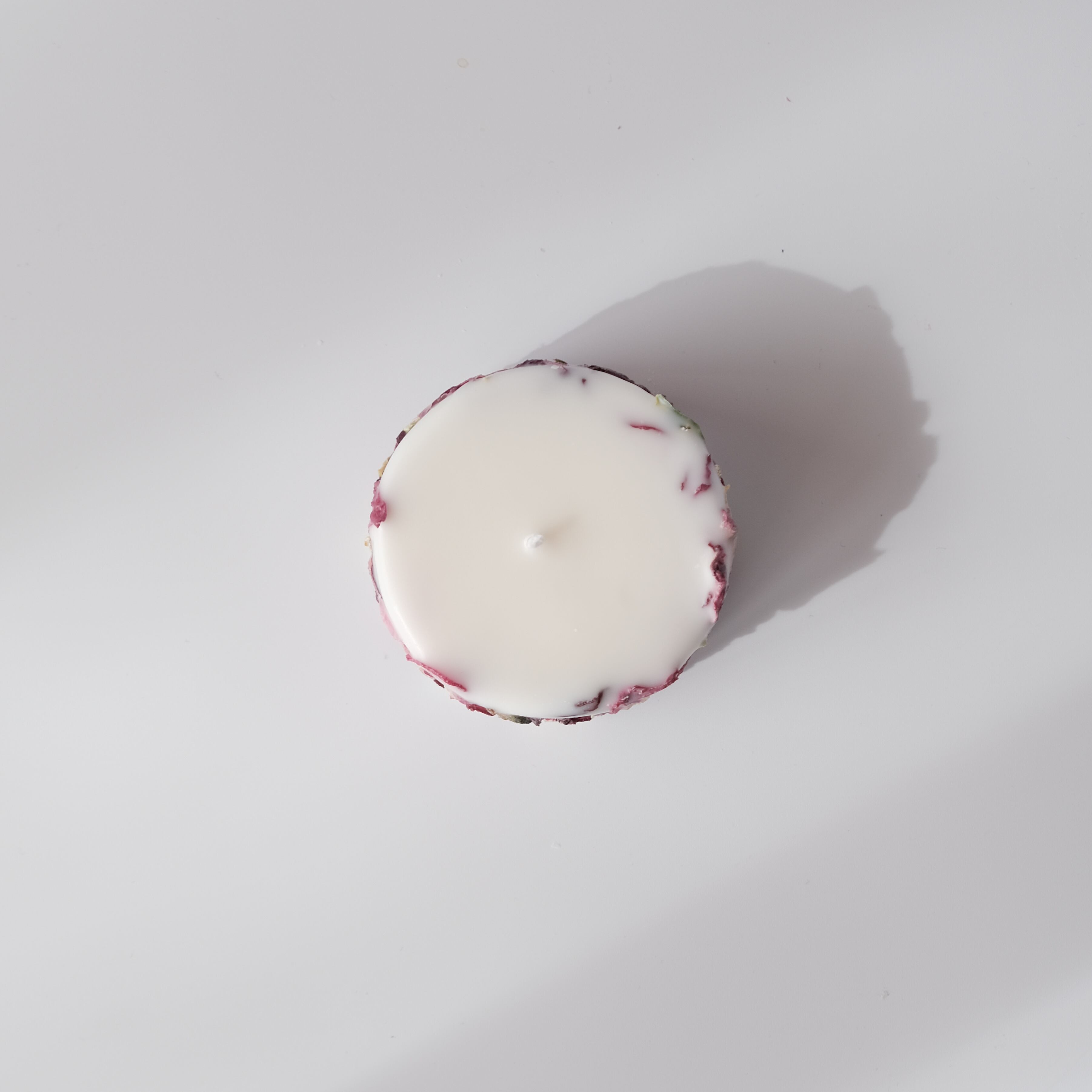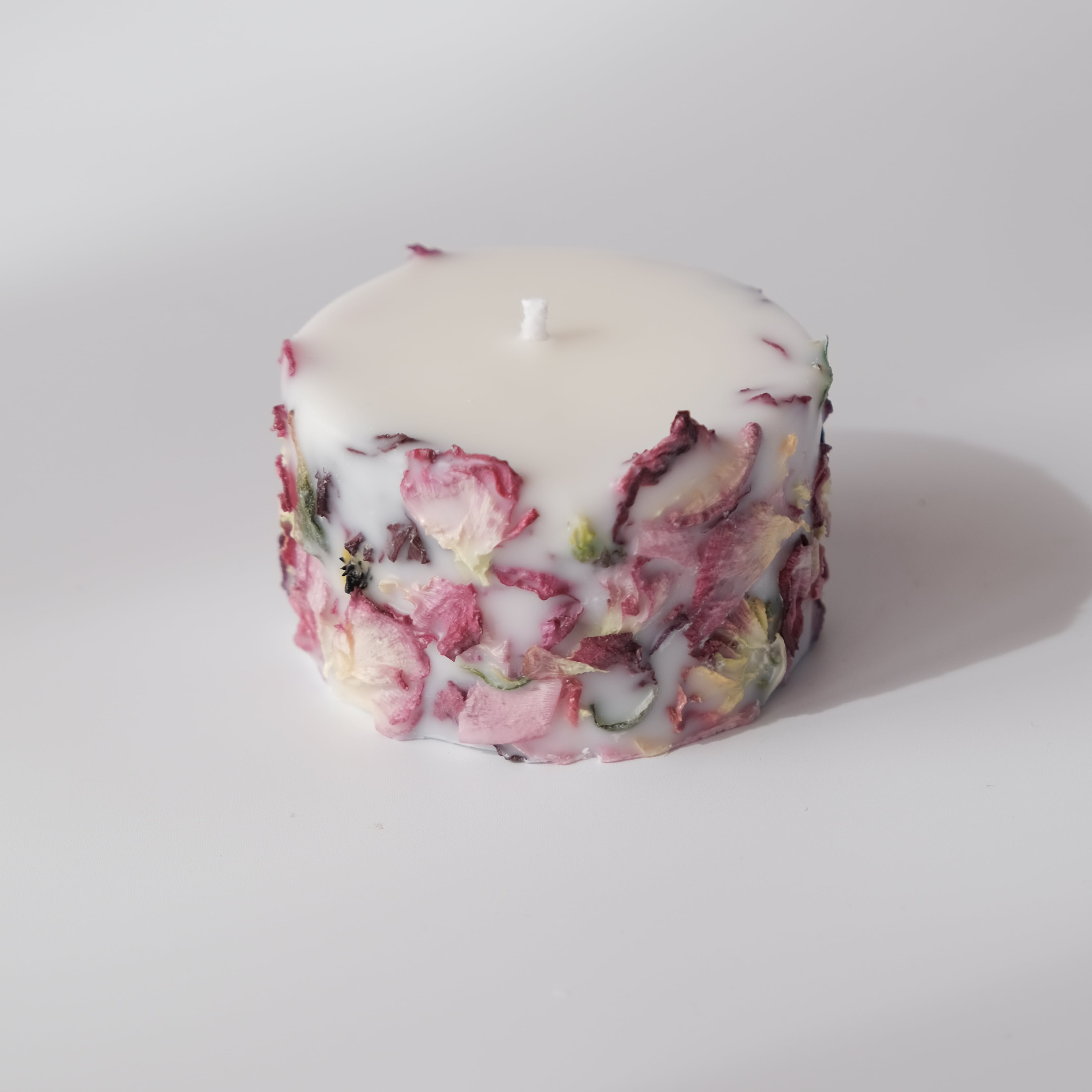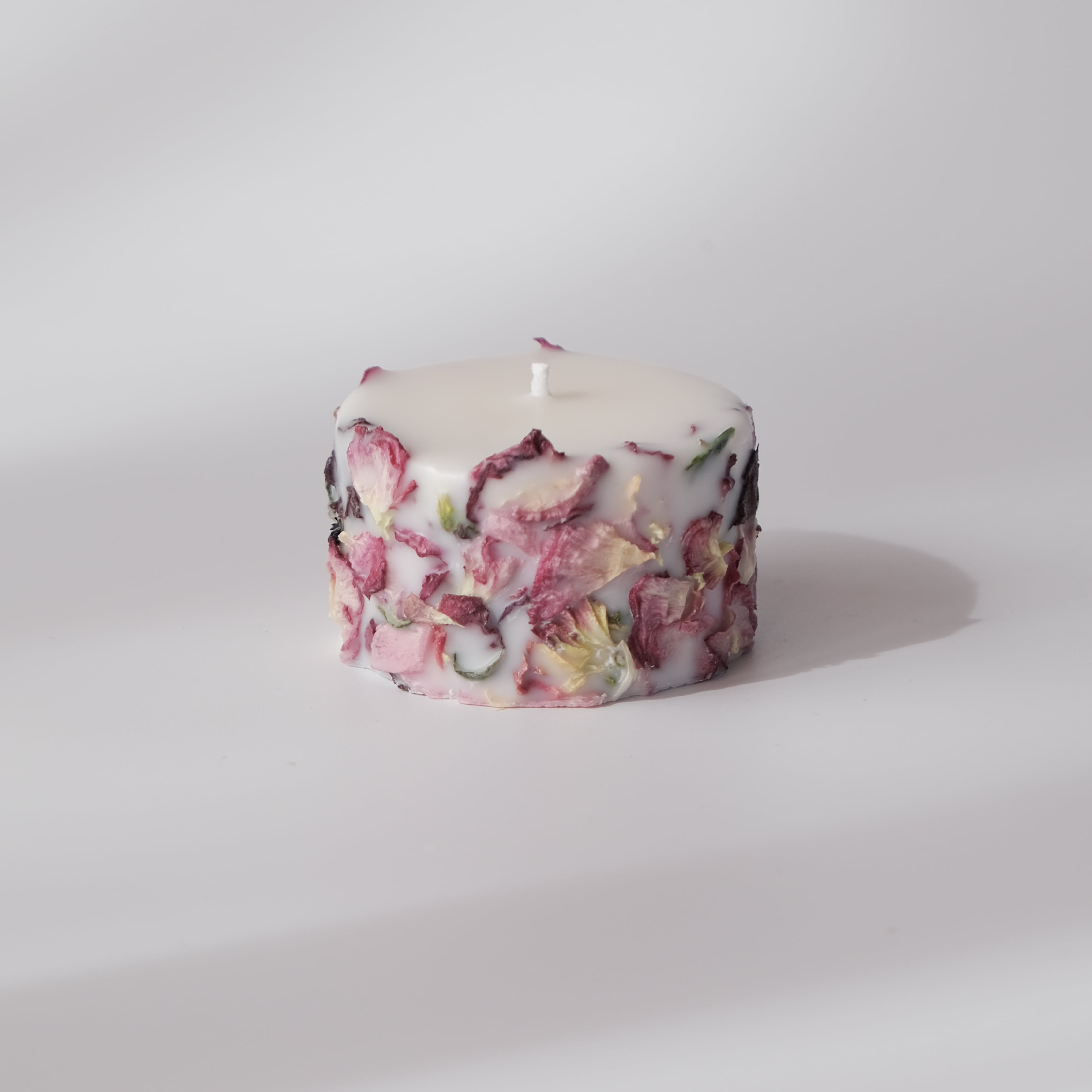信州松本市寿産のラナンキュラスのロスフラワーを使用したアップサイクルキャンドル。花びらの姿や色はそれぞれ違い、同じものは2度とできない一点物です。