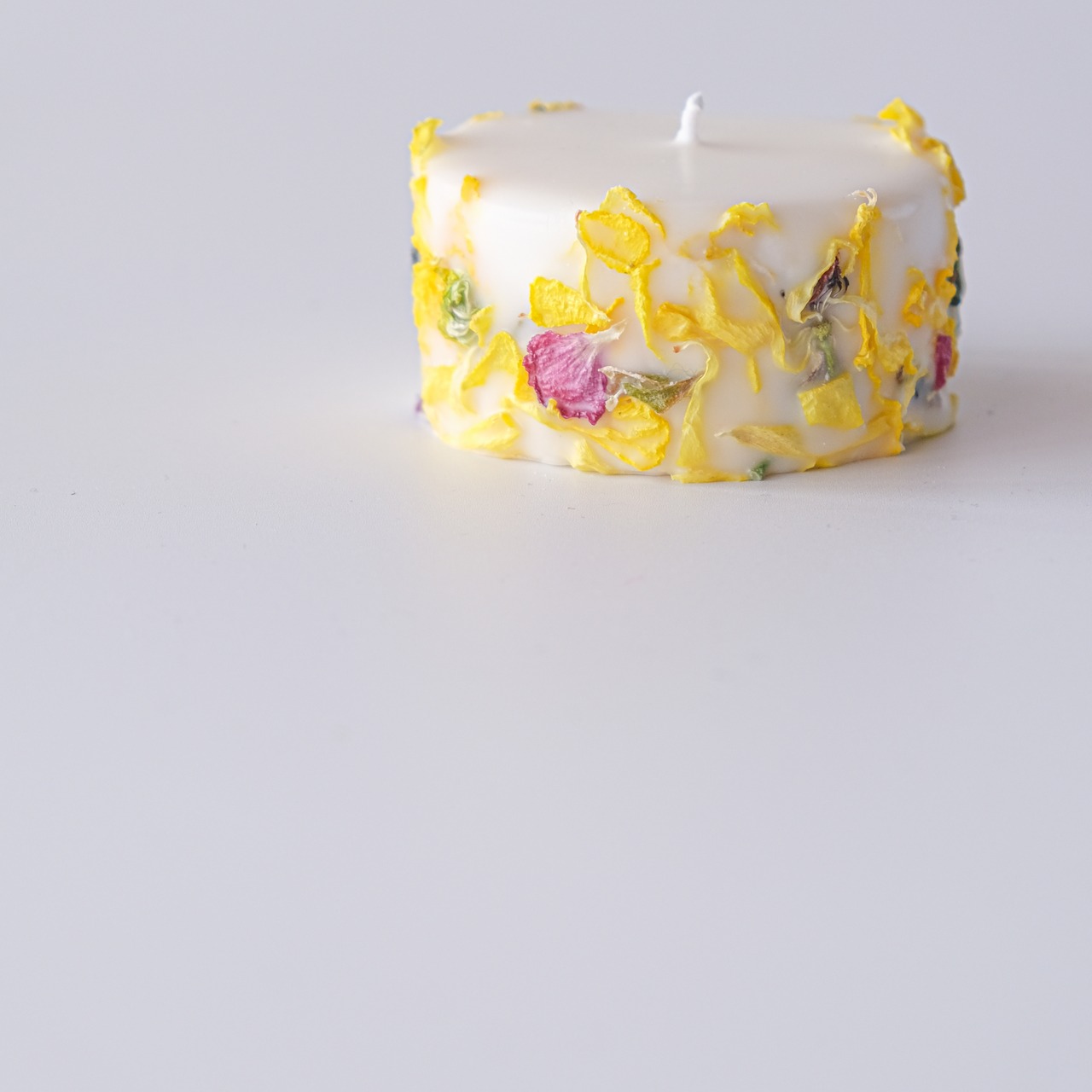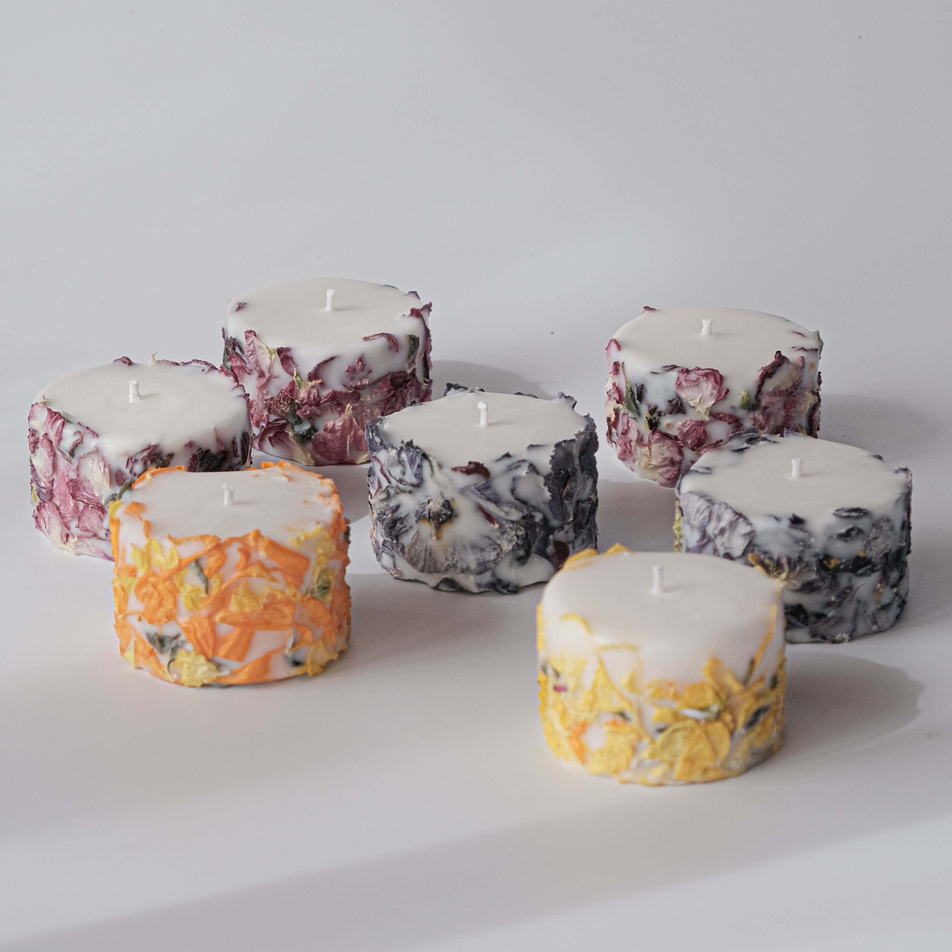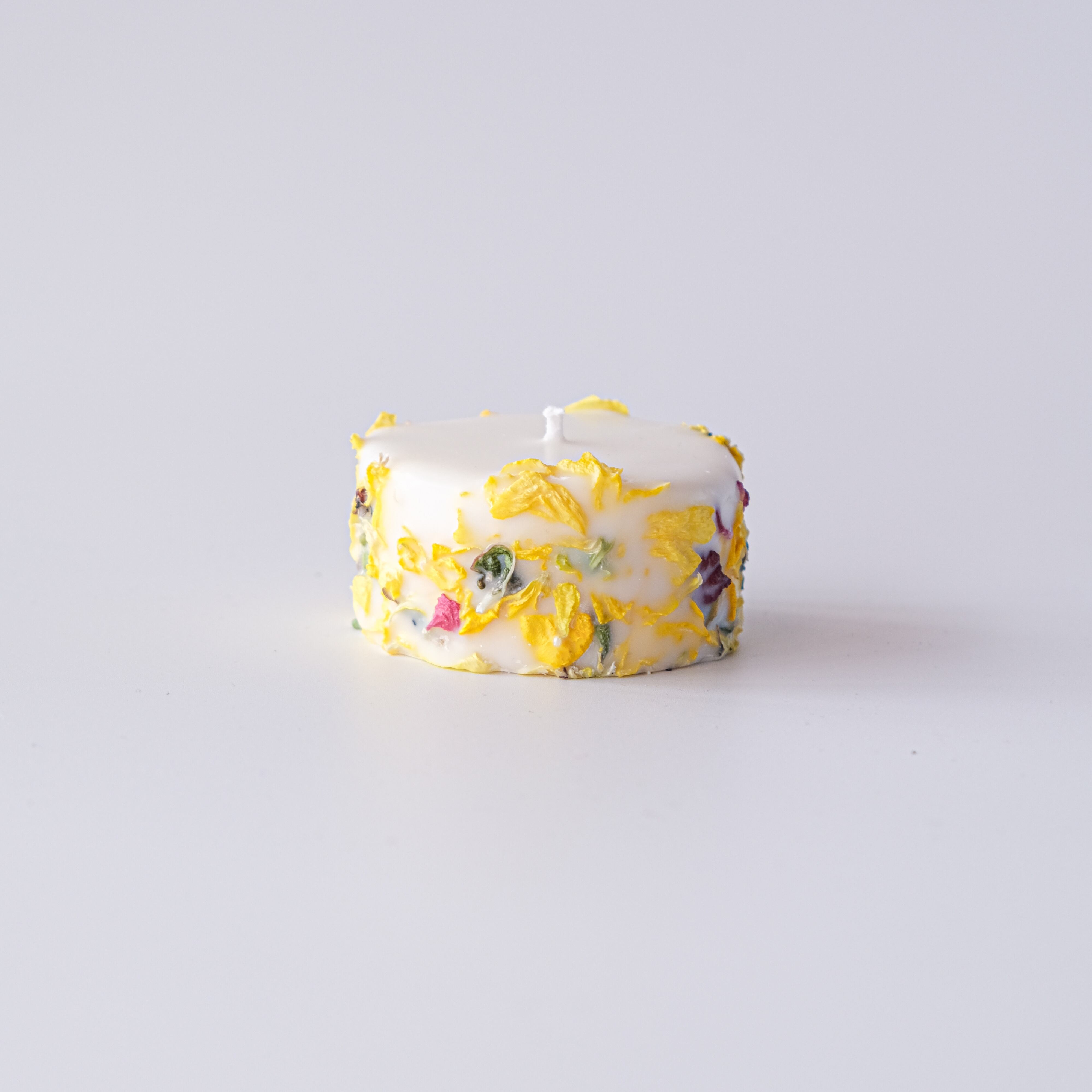 信州松本市寿産のラナンキュラスのロスフラワーを使用したアップサイクルキャンドル。花びらの姿や色はそれぞれ違い、同じものは2度とできない一点物です。