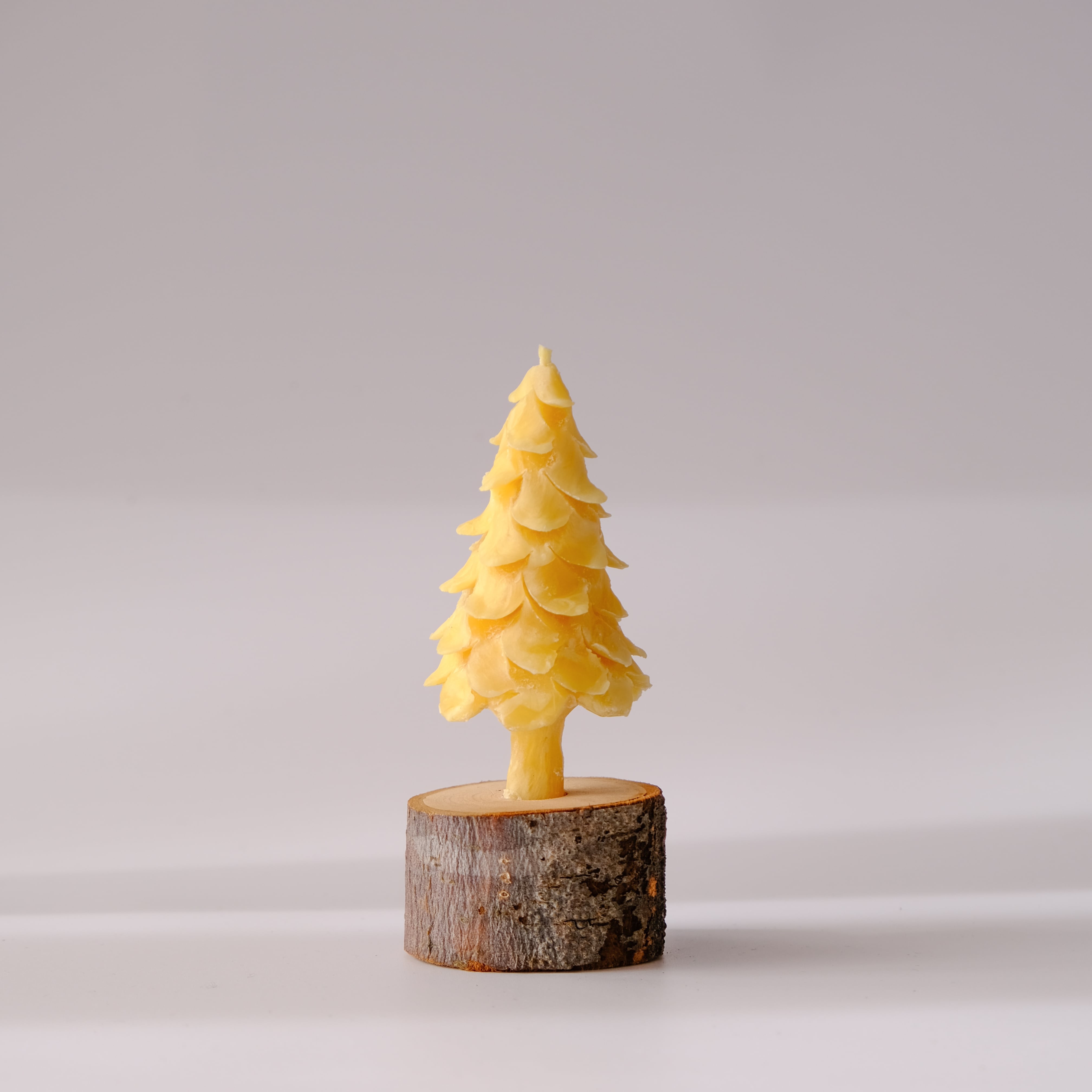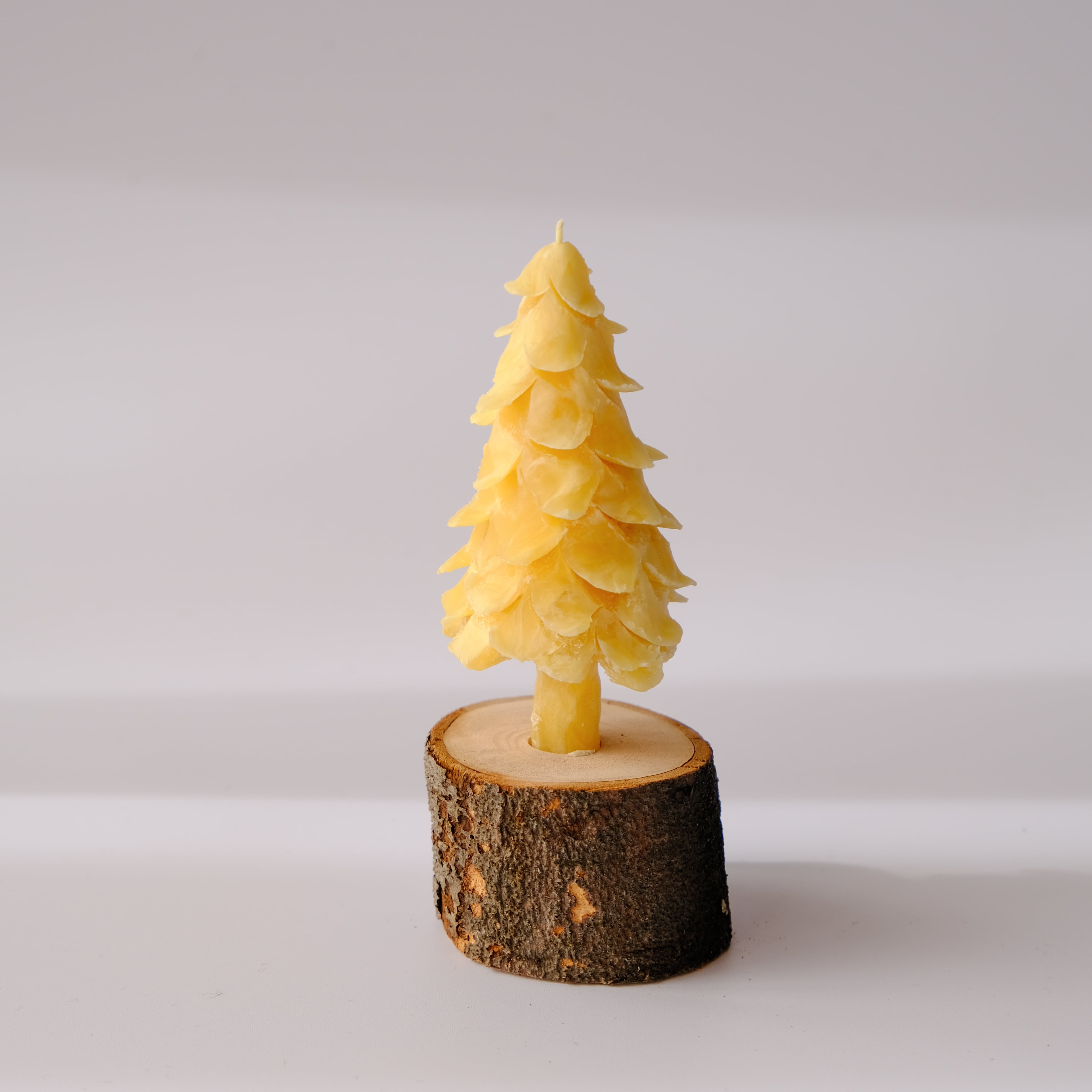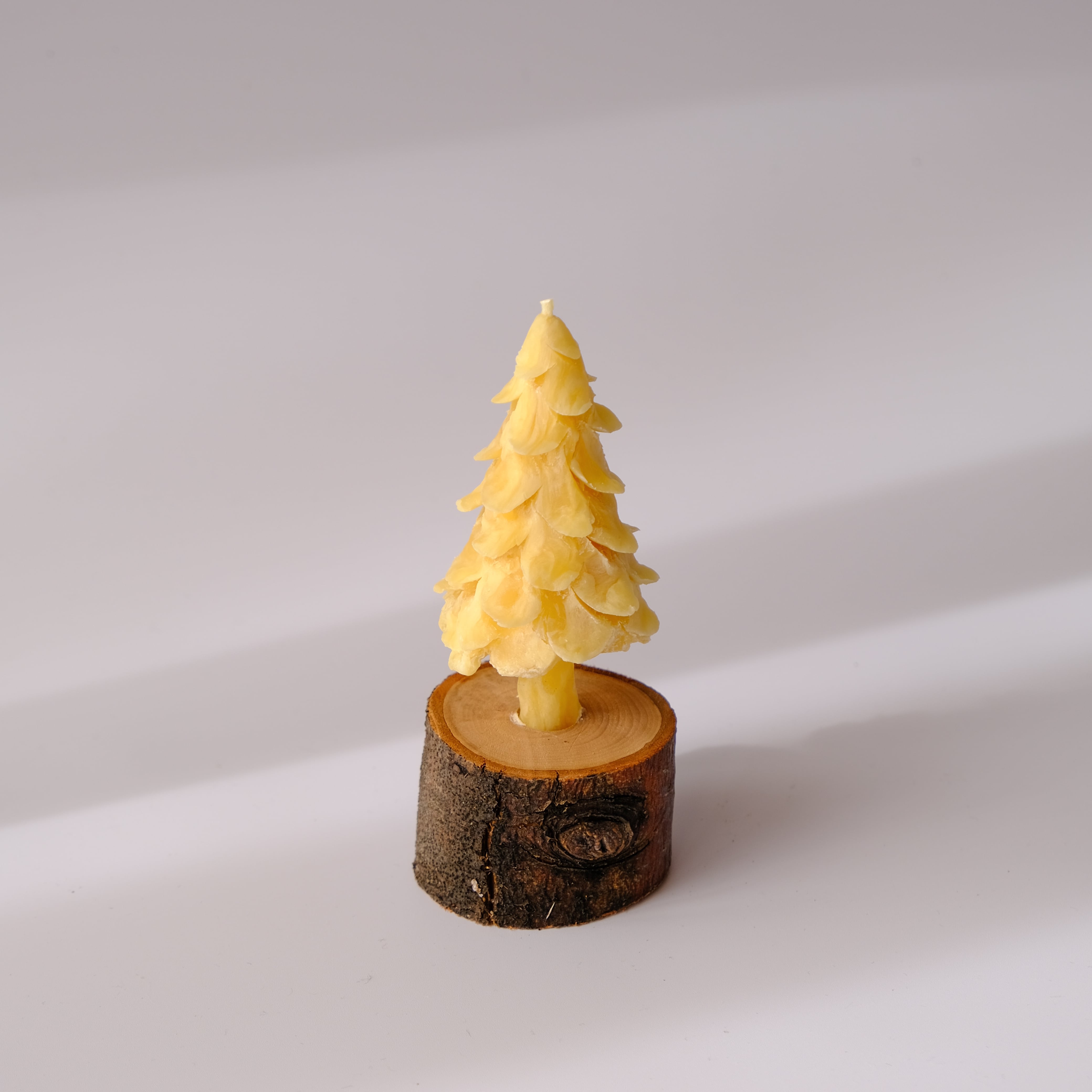 蜜蝋を掘り、針葉樹をイメージして成形しています。キャンドルはアトリエの周りのりんごの木に立てています。